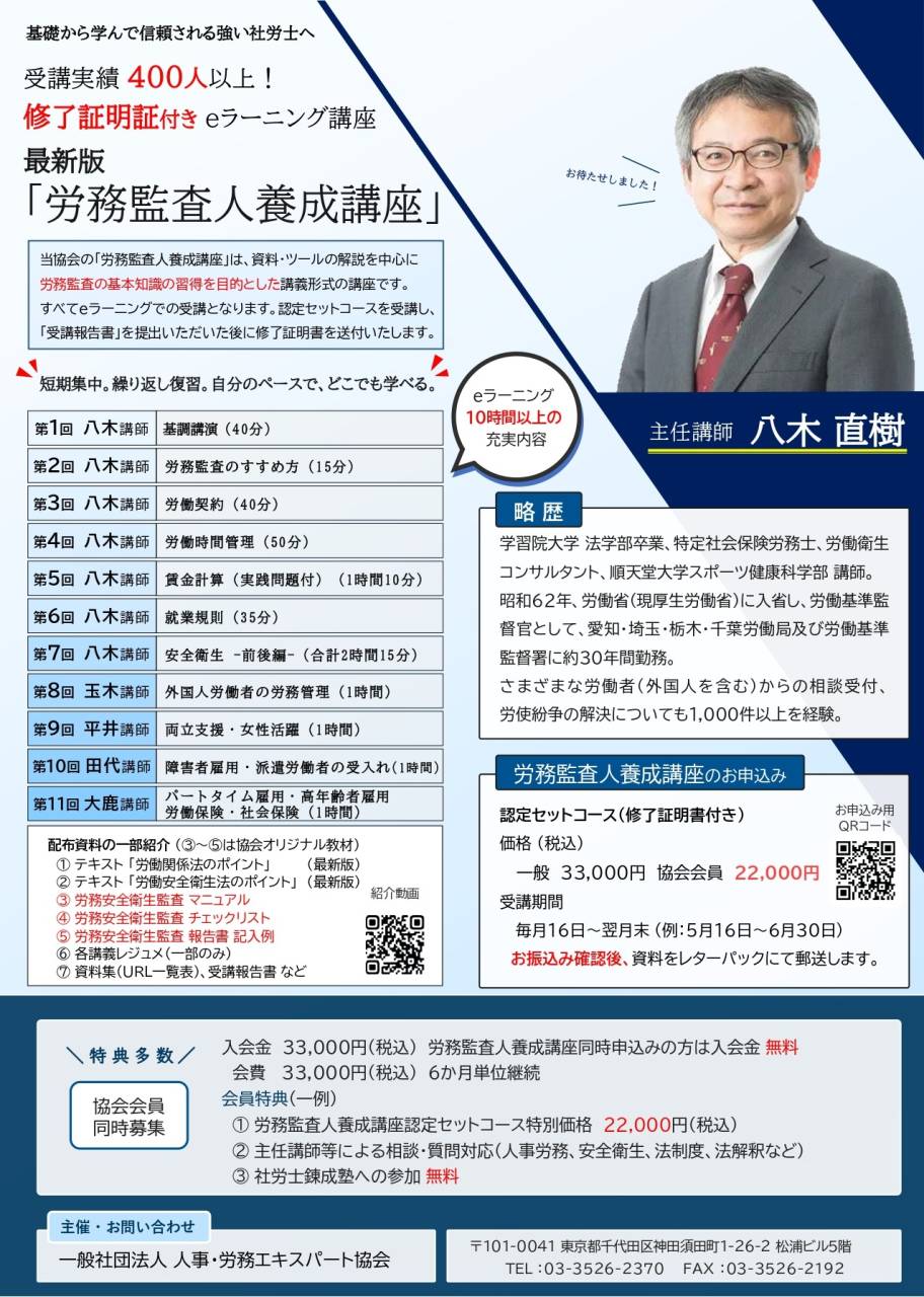 主任講師 | 八木 直樹 (特定社会保険労務士、労働衛生コンサルタント、元労働基準監督署長、順天堂大学スポーツ健康科学部 講師) |
